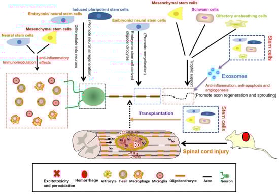 Schematic representation of the roles of stem cells in SCI repair. Reprinted from an open-access source [].