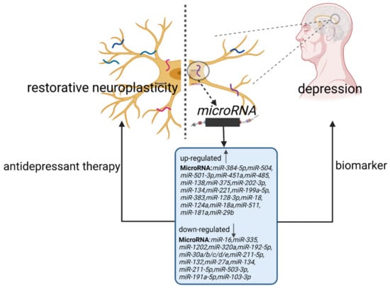 Neuroplasticity, also known as neural plasticity or brain plasticity, is a process that involves adaptive morphology, connectivity, and functions of neuronal network changes in response to internal or external stimuli []. Neuroplasticity is closely associated with the development of depression. MiRNAs are involved in this process and play important roles [] (Figure 1).