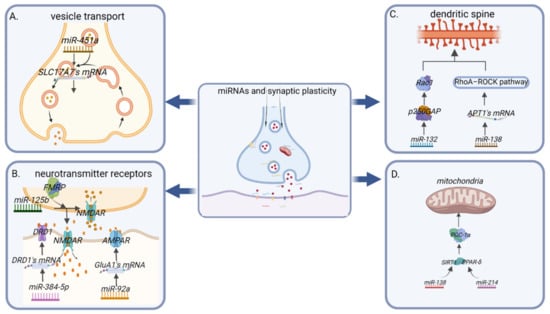 MRNAs and their translated proteins in neuronal dendrites and axons promote synaptic production and its maintenance. Mature miRNAs and pre-miRNAs localised in neurons participate in the regulation of synaptic protein synthesis []. MiRNAs have different distributions in subcellular regions in a manner similar to their distribution of axonal mRNA expression. When localised stimulation or injury occurs, specific miRNAs are transported to axons in forms of pre-miRNA. The levels of these pre-miRNAs change with injuries to regulate the translation of local mRNAs in axons []. Changes in synaptic structures and functions are called synaptic plasticity. Structural and functional plasticity are two interlinked, mutually-depended forms of synaptic plasticity, and both are associated with transmission efficiency and memory storage []. (Figure 2).