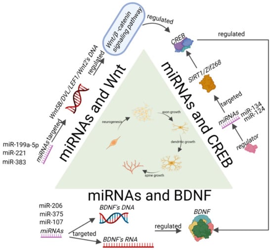 MiRNAs are the class of small noncoding single-strand RNAs with a length of 18–25 nucleotides that are involved in the regulation of post-transcriptional gene expression. The biogenesis of miRNAs has been well described. In general, RNA polymerase II transcribed the DNA to produce a primary miRNA (pri-miRNA) in the nucleus, which is cleaved by ribozyme III Drosha, cofactor DGCR8, and its cofactor TRBP, to become precursor miRNA (pre-miRNA). Pre-miRNAs are delivered to the cytoplasm by transporter exportin−5 where they are cleaved into mature miRNAs by cytoplasmic Rnase III Dicer. They inhibit gene expression levels by binding to 3′ untranslated region (3′UTR) of mRNA, leading to mRNA degradation or translation inhibition [,]. One single miRNA can regulate multiple target genes, and one single target gene can also be regulated by multiple miRNAs, indicating that the expression of multiple proteins in cells may act synergistically. Many miRNAs are expressed in large quantities in the nervous system in a tissue-specific manner, for example, in axons, dendritic spines, and presynaptic membranes to participate in the development and progression of neuroplasticity, including neurogenesis, neuronal maturation, synaptic formation, axon guidance, and neurite growth [].