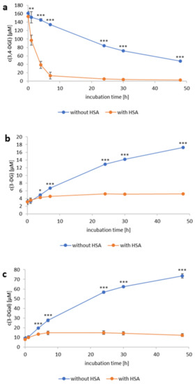 Human serum albumin (HSA) partially depletes 3,4-dideoxyglucosone-3-ene (3,4-DGE) from the model solution and, therefore, reduces its interconversion to 3-deoxyglucosone (3-DG) and 3-deoxygalactosone (3-DGal). 3,4-DGE (161.5 µM, containing 3.2 µM 3-DG and 9.1 µM 3-DGal) was incubated for 48 h at 37 °C in the absence (blue curve) or presence (orange curve) of HSA (40.0 mg/mL). The time course curves for the concentrations (in µM, mean ± SD) of (a) 3,4-DGE, (b) 3-DG, and (c) 3-DGal are shown. All experiments were performed in triplicates. Significant differences between the samples with and without HSA are marked (* p < 0.05, ** p < 0.01, *** p < 0.001).