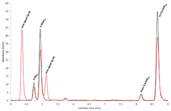 Secondly, GSH was selected as a substrate for incubation with 3,4-DGE. Our experiments monitored if and how plasma concentrations of GSH (18.2 µM in healthy individuals [37]) reacted with 3,4-DGE (165 µM) under physiological conditions in s-PBS at 37 °C during incubation for 48 h. For the quantification of the remaining 3,4-DGE contents, the samples were derivatized with ortho-phenylenediamine (o-PD) and analyzed by UHPLC-DAD. Already, immediately after the addition of 3,4-DGE, the formation of two new signals at 4.36 min and 5.13 min could be observed, which eluted at similar retention times as 3-DGQx and 3-DGalQx. To improve the quality of the UV-spectra, the GSH concentration was increased to 91.0 µM, thus enhancing the signal intensity (Figure 2). Both signals showed spectra that were typical for saturated quinoxaline structures (Scheme 1), indicating the formation of two saturated α-dicarbonyl compounds in the reaction mixture.