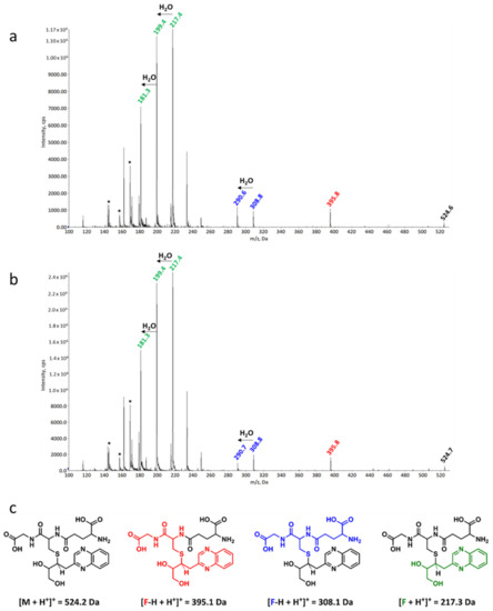 The EPI chromatograms supported the findings from the EMS and resulted in two signals at 4.42 min and 5.18 min. The two respective product ion spectra gained through fragmentation of the parent ion were nearly identical to each other (Figure 4a,b). The signals of the parent ions, [M+H]+, at 524.6/524.7 Da indicate that GSH forms two monoadducts with 3,4-DGE, which are subsequently derivatized to the respective quinoxalines. This assignment was confirmed by the fragmentation patterns, which were identical for both products. Three main fragments were identified (m/z 395.8 Da, 308.8 Da, and 217.4 Da) together with the corresponding fragments after a loss of water. Structures for these fragments are proposed in Figure 4c and are in good accordance with typical fragmentation patterns reported for GSH-xenobiotic adducts [38]. These fragments support the proposed mechanism that the thiol group of GSH attacks the conjugated double bond of 3,4-DGE via a Michael addition from two possible sites, forming two stereoisomers (see Scheme 2).