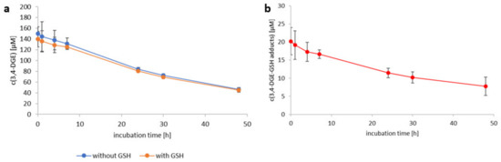 l-Glutathione (GSH) leads to an immediate formation of monoadducts with 3,4-dideoxyglucosone-3-ene (3,4-DGE). (a) Time-course curves are shown for the concentrations (in µM, mean ± SD; 3,4-DGE start concentration as analyzed 150.0 µM) of 3,4-DGE during 48 h of incubation at 37 °C either in absence (blue curve) or presence (orange curve) of GSH (18.2 µM). (b) The time-course curve for the concentration of the formed monoadducts is shown in red. The interconversion of 3,4-DGE to 3-deoxyglucosone (3-DG) and 3-deoxygalactosone (3-DGal) was not affected. All experiments were performed in triplicates; the areas of the two 3,4-DGE–GSH monoadducts were summed up. The differences between the samples with and without GSH are not significant.