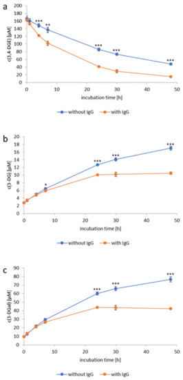 Human immunoglobulin G (IgG) partially depletes3,4-dideoxyglucosone-3-ene (3,4-DGE) from the model solution and, therefore, disables its interconversion to 3-deoxyglucosone (3-DG) and 3-deoxygalactosone (3-DGal). 3,4-DGE (166.2 µM, containing 2.8 µM 3-DG and 9.5 µM 3-DGal) was incubated for 48 h at 37 °C in the absence (blue curve) or presence (orange curve) of IgG (11.5 mg/mL). The time-course curves for the concentrations (in µM, mean ± SD) of (a) 3,4-DGE, (b) 3-DG, and (c) 3-DGal are shown. All experiments were performed in triplicates. Significant differences between the samples with and without IgG are marked (* p < 0.05, ** p < 0.01, *** p < 0.001).