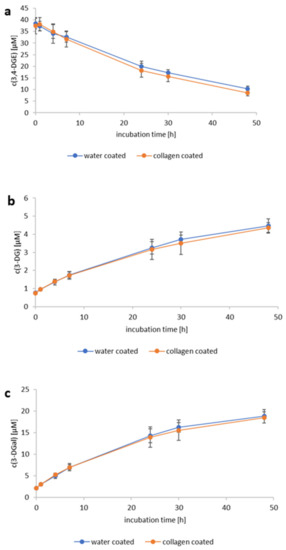 Collagen type IV is the main collagen type found in basement membranes [49] and represents one of the principal components of blood vessels that is next to the endothelium and in proximal contact with the blood stream. Therefore, we investigated a possible reaction between this collagen type and 3,4-DGE. For this purpose, Eppendorf tubes (Hamburg, Germany) were coated with reconstituted collagen to mimic vessels and subsequently incubated with and without 3,4-DGE in s-PBS at 37 °C for 48 h. Because of the comparably low protein content in the tube during incubation, a lower 3,4-DGE concentration of 41.3 µM was applied so that slighter differences between the analyte concentrations in the coated and non-coated tubes could be detected. In fact, no significant differences could be found, and the 3,4-DGE degradation as well as its interconversion to 3-DG and 3-DGal followed the same trends, as described for the substrate-free solutions (Figure 7). Previously, Tauer et al. have observed that collagen had no effect on 3-DG and glyoxal concentrations after incubation of glucose-based peritoneal dialysis fluids in collagen-coated wells (type not specified) for six hours [32]. On the other hand, glycation of collagen has been reported, e.g., in collagen derived from rat-tail tendon incubated with millimolar concentrations of glucose [50] or ribose [51]. It seems, therefore, that glycation of collagen is highly dependent on both the collagen type and glycating agent. Moreover, the typical triple-helical domains of collagen and its aggregation to supramolecular structures [52] might contribute to the limited reactivity: Since part of the amino acid side chains are aligned towards the interior of the helices and assemblies, those are not as readily available for reaction with 3,4-DGE as the amino acids on the surface.