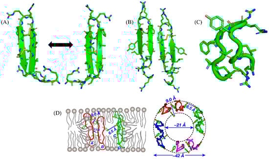 - Mani, R.; Cady, S.D.; Tang, M.; Waring, A.J.; Lehrer, R.I.; Hong, M. Membrane-dependent oligomeric structure and pore formation of a beta-hairpin antimicrobial peptide in lipid bilayers from solid-state NMR. Proc. Natl. Acad. Sci. USA 2006, 103, 16242–16247. [Google Scholar] [CrossRef] [PubMed]