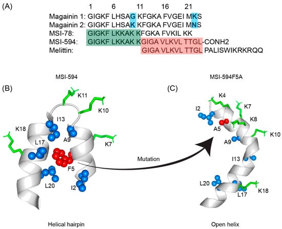 - Domadia, P.N.; Bhunia, A.; Ramamoorthy, A.; Bhattacharjya, S. Structure, interactions, and antibacterial activities of MSI-594 derived mutant peptide MSI-594F5A in lipopolysaccharide micelles: Role of the helical hairpin conformation in outer-membrane permeabilization. J. Am. Chem. Soc. 2010, 132, 18417–18428. [Google Scholar] [CrossRef]