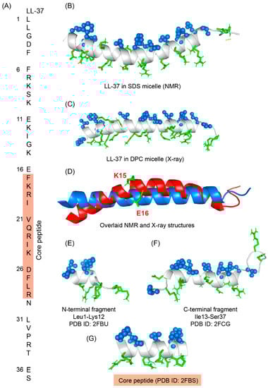 - Li, X.; Li, Y.; Han, H.; Miller, D.W.; Wang, G. Solution structures of human LL-37 fragments and NMR-based identification of a minimal membrane-targeting antimicrobial and anticancer region. J. Am. Chem. Soc. 2006, 128, 5776–5785. [Google Scholar] [CrossRef] [PubMed]