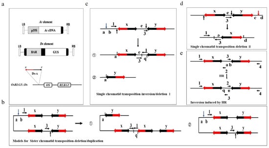 The amount of various family genes that display redundant function clustering at the chromosomes hampers the study of gene function in rice. Ac/Ds transposable elements generate chromosomal rearrangements including deletions, inversions, and duplications via the alternative transposition mechanism in rice []. To study the function of the redundant family genes, many chromosome fragment rearrangement/deletion mutants induced by the Ac/Ds system were developed. The T-DNA provided for transposase was constructed containing the CaMV 35S promoter to drive the Ac cDNA. Another T-DNA was constructed containing a modified Ds element (Figure 1a). A schematic diagram of the mechanism of a pair of closely located Ds-induced deletion/rearrangements and homologous recombination on chromosomes is presented in Figure 1 b–e. The mechanism was analyzed in detail in a previous study [].