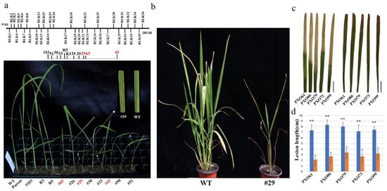 In a previous study, we identified a Ds element at the RLK19/RLG5 locus. We found that this RLK family consists of 36 members and contains a cluster located on chromosome 1 []. To test the RLK family function, two Ds elements closely located at the RLK19 locus were first generated and the large fragment deletions with one to 11 RLKs deletions were further identified. Among them, the deletion mutants with a loss of eight and 11 RLKs exhibited lesion mimic symptoms. In this study, the deletion lines were further analyzed and the #29 mutant with the RLK19-22 deletion was identified (Figure 2a). The #29 mutant displayed lesion mimic symptoms (Figure 2b). To analyze whether the #29 mutant had the characteristics of autoimmunity, mutant plants were first inoculated with five different Xoo races (PXO61, PXO71, PXO79, PXO86, PXO99). The lesion lengths were measured two weeks after the inoculation and the results demonstrated that the #29 mutant plants exhibited high and broad-spectrum resistance to Xoo (Figure 2c,d).
