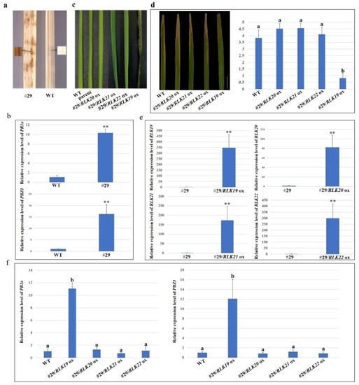 DAB staining showed that the level of H2O2 was significantly higher in the #29 mutants compared to the wild-type plants (Figure 3a). In addition, the qRT-PCR results showed that relative expression levels of PR genes (PR1a and PBZ1) were significantly induced in #29 compared to those of the wild-type (Figure 3b). To investigate which RLK regulates lesion mimic and defense against Xoo in the #29 mutants, RLK19, RLK20, RLK21, or RLK22 genes were individually expressed using the non-specific promoter 35S in the #29 mutant plants. The reconstruction of RLK20, RLK21, or RLK22 all complemented the mutant phenotype, with RLK19 proving to be the exception (Figure 3c). Leaves of the four kinds of transgenic complementary plants were inoculated with PXO86. The results showed that #29/RLK20 ox, #29/RLK21 ox, and #29/RLK22 ox plants were susceptible to PXO86, similar to the wild-type plants (Figure 3d). The #29/RLK19 ox plants, however, were resistant to PXO86. qRT-PCR was performed to detect the gene levels in the complementation plants. The qRT-PCR results demonstrated that RLK19, RLK20, RLK21, and RLK22 were highly expressed in leaves, while no transcripts were detected in the #29 mutant plants (Figure 3e). The expression levels of PR1a and PBZ1 in #29/RLK20 ox, #29/RLK21 ox, and #29/RLK22 ox plants were similar to the wild-type plants (Figure 3f). The #29/RLK19 ox plants, however, demonstrated significantly higher expression compared to the wild-type. These results suggest that RLK19, 20, and 21 are required for the lesion mimic and bacterial resistance in the #29 mutant plants.