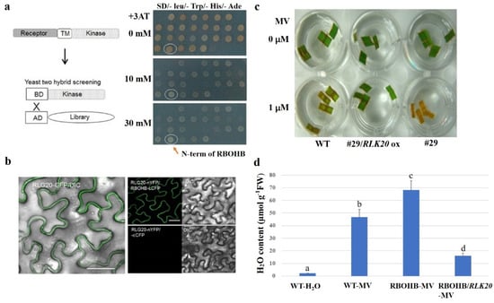 RLK20 interact with RBOHB regulating ROS production. (a) Screening of RLK20 interacting protein by the yeast two-hybrid system. (b) Colocalization of RLK20 and RBOBH in tobacco leaves by BiFC. (c) The leaves of the #29 mutant, #29/RLK20 ox, and wild-type plants after MV treatment. (d) H2O2 content in RBOHB-transformed or RBOHB/RLK20-transformed tobacco leaves after being treated with MV. Data indicates the average ± standard error (SE) (n > 6). The letters a, b, c, and d denote significant differences. p < 0.05.