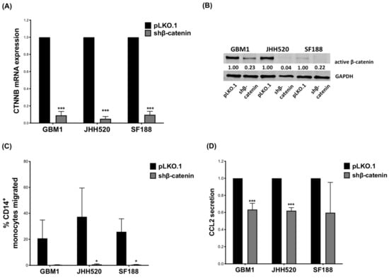 β-catenin knockdown in GBM cells reduces migration of CD14+ monocytes in vitro: (A) GBM cell lines (GBM1, JHH520, SF188) were transduced with lentiviral particles containing shβ-catenin plasmids and knockdown efficiency (relative mRNA expression) was confirmed using RT-qPCR and (B) Western blotting. (C) CD14+ monocyte migration towards TCM of β-catenin knockdown cells was decreased compared to migration towards TCM of control (pLKO.1) cells. (D) CCL2 levels in TCM of shβ-catenin GBM cells were measured after 24 h incubation by ELISA and compared to control cells (pLKO.1). The relative CCL2 secretion data are presented as mean ± SD (n = 3). Statistical significance was calculated with unpaired t-test. * p ≤ 0.05 *** p ≤ 0.001.