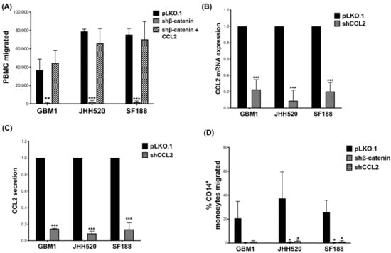 Recombinant CCL2 restored PBMC migration in shβ-catenin TCM and CCL2 knockdown reduced monocyte migration: (A) Recombinant CCL2 (100 ng/mL) was added to the TCM of β-catenin knockdown cells and restored PBMC-attracting ability. GBM cell lines were transduced with lentiviral particles containing shCCL2 plasmids and knockdown efficiency (relative mRNA expression and relative CCL2 secretion) was confirmed using (B) RT-qPCR and (C) ELISA, respectively. (D) CD14+-monocyte migration was decreased after treatment with TCM of shCCL2 knockdown cells compared to treatment with TCM of control (pLKO.1) cells. Data are presented as mean ± SD (n = 3). Statistical significance was calculated with unpaired t-test. * p ≤ 0.05, ** p ≤ 0.01, *** p ≤ 0.001.