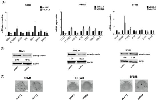 To determine the effects of CCL2 on β-catenin activity, we further analyzed the phenotype of CCL2 suppressed GBM cells. We investigated the expression of β-catenin target (AXIN2, MYC) and further EMT–related genes (ZEB1, SNAI1 and SNAI2). Following CCL2 knockdown, CTNNB1 mRNA expression was upregulated, though not statistically significant in GBM1 and SF188. SNAI2 expression was significantly reduced in all cell lines (Figure 3A). Gene expression of AXIN2, MYC, ZEB1 and SNAI1 was significantly different in JHH520 cells, but this could not be confirmed in GBM1 and SF188 cells (Figure 3A). Western blot analysis revealed significantly reduced β-catenin protein levels in GBM1 (p = 0.0013) and JHH520 (p = 0.0013) compared to the control cells (pLKO.1). In SF188 cells, CCL2 suppression significantly increased β-catenin protein levels (Figure 3B, p = 0.0003).