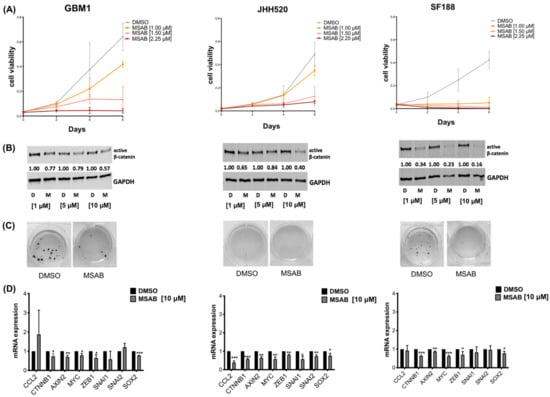 3.4. The β-Catenin Inhibitor MSAB Reduces Viability, Active β-Catenin Levels, Clonogenicity and Expression of β-Catenin Associated Genes in GBM Cells