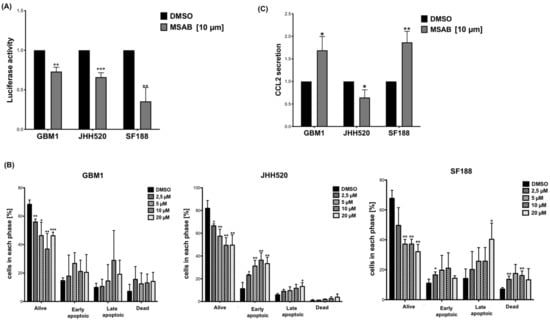 We used a Luciferase Reporter assay driven by CTNNB1/β-catenin binding to multimerized TCF/LEF promoter sites, to measure canonical Wnt/β-catenin activity in the cell lines. Wnt-signaling was significantly reduced in all three cell lines after treatment with MSAB (Figure 5A). Furthermore, treatment with MSAB for 24 h resulted in increased apoptosis of GBM cells (Figure 5B). Similarly, treatment of GBM cell lines with MSAB altered secretion of CCL2 levels (Figure 5C). Treatment of GBM cells with MSAB (24 h) increased CCL2 levels in the supernatants of GBM1 (p = 0.0175) and SF188 (p = 0.0036), while the supernatant of JHH520 (p = 0.0224) showed significantly reduced CCL2 levels (Figure 5C).