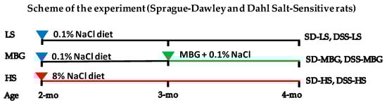 The experimental protocol was approved by the Animal Care and Use Committees of the National Institute on Aging (NIA, NIH). Animal care followed the NIH Guide for the Care and Use of Laboratory Animals. Eight-week-old male DSS and SD rats (Charles River, Frederick, MD, USA) were maintained in a temperature-controlled room regulated (26 °C) on a 12 h light/dark cycle with free access to water. SD and DSS rats were randomly selected to receive a rodent diet containing HS (8% NaCl, Harlan Teklad, Madison, WI, USA; n = 18/18) or LS (0.1% NaCl, Harlan Teklad, Madison, WI, USA; n = 36/29) for 8 weeks. Subgroups of animals on an LS diet were administered MBG (50 μg/kg/day; n = 18/15) via osmotic Alzet (DURECT, Cupertino, CA, USA) minipumps for the last 4 weeks of the study (Figure 1, Results section) as described []. The following 6 groups of rats were studied: SD-LS, SD-MBG, SD-HS, DSS-LS, DSS-MBG, and DSS-HS. Body weight, SBP, ECHO measurements, and 24 h urine collection were performed at week 8 of the experiment.