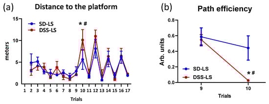 Animals were tested on a redundant place-cue version of the water maze in which they initially swim to a visible platform in a fixed location across trials. Rats can solve these trials using either a non-spatial goal approach strategy, or by learning the location of the platform relative to extra-maze cues, i.e., a capacity that requires the integrity of the hippocampus (for details, see Section 5.5). Both SD-LS and DSS-LS rats traveled the same distance to reach a visible platform during training (trials 2–9) in the MWM test (Figure 2a). To assess the extent that rats encoded the location of the platform via spatial cues, the platform was hidden under the water on trials 10, 12, 14 and 16 (Figure 2a). On the first nonvisible platform trial (trial 10), DSS-LS rats traveled longer distances to the platform than in trial 9, specifically, the last trial with the visible platform in comparison to SD-LS, which did not exhibit difference in distance between trials 9 and 10 (Figure 2a). The transfer between trials 9 and 10 means learning ability and memory for the spatial location of the escape platform. The DSS-LS rats exhibited poorer performance in this task vs. SD-LS rats. To note, no difference in travelled distance was observed in trials 11–17 between DSS and SD rats. Path efficiency is a ratio of the optimal path to the platform to the actual route taken by the individual rat (Figure 2b). This ratio was used to quantify the efficiency of the strategy pursued in reaching the platform. It was similar in the SD-LS and DSS-LS groups in trial 9, with the visible platform, and became significantly worse in DSS-LS rats in trial 10, when the platform was not visible for the first time (Figure 2b). The SD-LS did not exhibit differences in path efficiency between trials 9 (visible platform) and 10 (invisible platform) (Figure 2b).