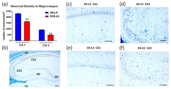 The hippocampus is a brain region critical for normal memory function, including spatial memory []. The density of neurons was lower in the CA3 region vs. the CA1 region in both rat strains, which is in agreement with normal hippocampal anatomy (Figure 3a). Rats from the DSS-LS group demonstrated a significantly lower density of neurons in both the CA1 and CA3 regions of the hippocampus in comparison to the SD-LS group (Figure 3a,c–f). The neuronal count represented the sum of pyramidal neurons and neuronal cell bodies in the selected fields, presented in Figure 3b, and was expressed as the number of neurons per mm2 of the measured area. We further found that hippocampal neuronal density was affected neither by MBG nor by HS, in both SD and DSS rats in comparison to their LS controls (data are not presented).