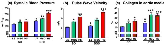 Effect of administration of MBG and high-salt (HS) dietary intervention on systolic blood pressure (a), pulse wave velocity (b), and collagen abundance in aortic wall (c). Bars represent mean ± SEM. Two-way ANOVA followed by Holm-Sidak’s multiple comparison post hoc test: * p < 0.05, ** p < 0.01 vs. LS groups for both SD and DSS rats; # p < 0.01 DSS vs. SD; & 0.05 < p < 0.1, vs. SD-LS. Two-tail unpaired t-test: † p < 0.05, DSS-LS vs. SD-LS (pulse wave velocity). Experimental group: LS, low salt for 8 weeks (blue bars); MBG, administration of MBG for 4 weeks (green bars); HS, high salt for 8 weeks (red bars); SD, Sprague–Dawley rats; DSS, Dahl salt-sensitive rats.