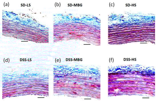 Both SD and DSS rats administered MBG or an HS diet, exhibited higher collagen abundance in the aortic wall vs. LS controls (Figure 4c), similarly to the aortic weight changes (Table 2, Tissue Weights). Notably, the increase in aortic wall collagen in the SD rats treated with both stressors, i.e., MBG and HS, was moderate in comparison to DSS rats. The representative photomicrographs of the aortae from each experimental group, stained with Masson’s trichrome stain, are presented in Figure 5a–f. Some of the aortic samples were stained with Verhoeff’s stain to detect elastin abundance (Supplementary Figure S1). No difference in the amount of elastin between the SD and DSS strains, nor between the three treatments, i.e., LS, MBG and HS (data not presented), were detected.