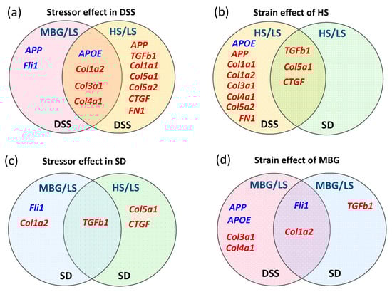 The data on the profibrotic and AD-related gene expression in both strains treated with MBG and HS stressors are summarized in the Venn diagrams in Figure 6. It is likely that in DSS rats, MBG initiated profibrotic signaling via the Fli-1-dependent pathway, whereas HS intake involved TGFβ-1-dependent profibrotic signaling, exhibiting a dissociation between the two stressors in the DSS model. In SD rats, MBG administration was associated with the activation of both Fli-1- and TGFβ-1-dependent profibrotic signaling, whereas the HS intervention was accompanied by the activation of the TGFβ-1 pathway only, similar to DSS rats (Figure 6).