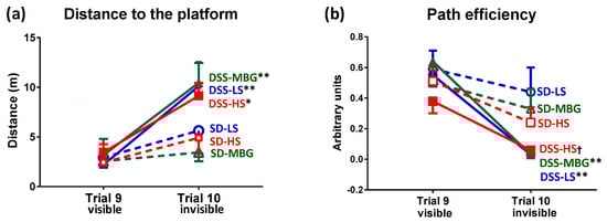 As presented above, DSS-LS rats demonstrated an impaired spatial memory compared to SD-LS rats (Section 2.1.3). The treatment of the DSS rats with MBG or HS did not change their performance in the MWM test. A similar pattern was observed in the SD groups, i.e., none of the stressors affected results of the SD rats (SD-MBG or SD-HS) in the MWM test (Figure 7). All DSS rats, i.e., the DSS-LS, DSS-MBG, and DSS-HS groups, traveled significantly longer distances to find the invisible platform than the SD rats with the corresponding treatment. SD rats showed stronger transfer between visible (trial 9) and hidden (trial 10) platform trials, suggesting better learning and memory for the escape location (Figure 7a). DSS rats in the three experimental groups were less efficient in finding the hidden platform, i.e., they exhibited a decrease in path efficiency in trial 10 (invisible) vs. trial 9 (visible), unlike the corresponding SD groups (Figure 7b) (for details, see the Methods, Section 5.5).