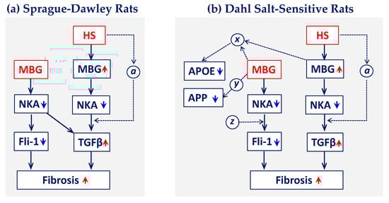 Pretreatment of cultured LV myocytes from DSS rats [], aortic explants [] and vascular smooth muscle cells from SD [] rats with a nanomolar concentration of MBG stimulated TGFβ- and/or Fli1-dependent profibrotic signaling, accompanied by a concomitant increase in the levels of collagen. These previous findings provide mechanistic support to the present observations related to the profibrotic activity of MBG. The novelty of the present study is in the comparison of the effects of MBG and HS in DSS rats and in SD rats, a wild type of DSS strain. The profibrotic, prohypertensive, and cardiovascular remodeling effects of the stressors were similar in both strains, although the magnitude of the changes was higher in DSS in comparison to SD rats (Figure 8). An HS diet induced hypertension and cardiac remodeling, resulting in congestive heart failure [,], cardiovascular and renal fibrosis [,], and stroke in young DSS rats [,,]. Moreover, the HS diet affected CAS in SD rats as well. HS intake in young normotensive SD rats induced vascular fibrosis via pressure-independent/MBG-dependent mechanisms. This remodeling was reduced by immunoneutralization of MBG []. Interestingly, the administration of MBG and HS was associated with the stimulation of different profibrotic gene profiles in SD and DSS rats. MBG administration was associated with the upregulation of TGFβ, the downregulation of the Fli-1 gene and the upregulation of the col-1a1 gene, which indicates activation of both TGFβ- and Fli-1 dependent profibrotic pathways by MBG in normotensive SD rats (Table 4). HS administration was associated with predominant activation of TGFβ signaling, which was accompanied by activation of some genes, controlled collagen synthesis and Ctgf (Table 4, Figure 6 and Figure 8a). In contrast, MBG administration in DSS rats led to the activation of Fli-1 dependent profibrotic signaling with an activation of several collagen-controlling genes (Table 5). HS diet in DSS rats predominantly activated TGFβ signaling which led to the activation of collagens and Ctgf (Table 5, Figure 6 and Figure 8b).