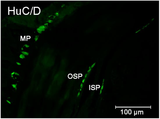 Organization of the enteric neurons in the pig intestine wall demonstrated by the labeling with Hu C/D—used as a pan neuronal marker. Elements of the enteric nervous system: MP—myenteric plexus; OSP—intestinal outer submucosal plexus; ISP—intestinal inner submucosal plexus.