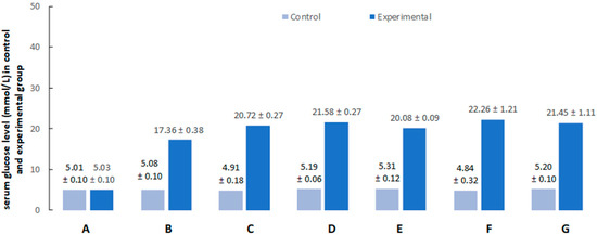 Serum glucose levels after citrate buffer (light blue bars) or streptozotocin (dark blue bars) administration (A) at the beginning of the experiment, (B) after 1 week, (C) after 2 weeks, (D) after 3 weeks, (E) after 4 weeks, (F) after 5 weeks, and (G) after 6 weeks.