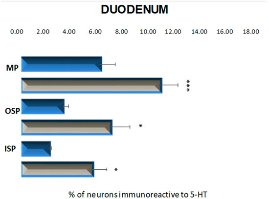 Schematic diagram of the proportion of perikarya immunoreactive to 5-HT of the control (blue bars) and experimental group (grey bars) in the particular parts of duodenum. OSP—the outer submucosal plexus; ISP—the inner submucosal plexus; MP—the myenteric plexus. * p < 0.05 and *** p < 0.001 indicate differences between all groups for the same neuronal population.