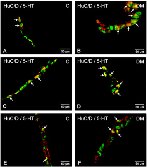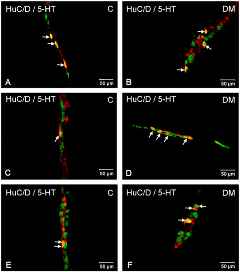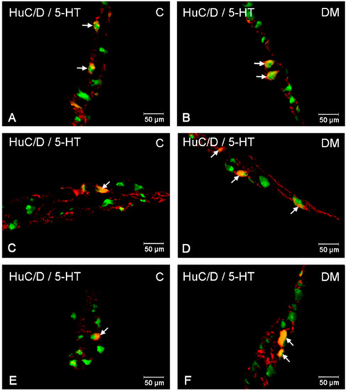 Immunofluorescent microphotographs showing serotonin immunoreactive perikarya in jejunum in the myenteric plexus of the control (A) and in experimental group (B); inner submucosal plexus of the control (C) and in experimental group (D); outer submucosal plexus of the control (E) and in the experimental group (F). (C)—control group; (DM)—diabetes mellitus. Photographs in the right column were created by digital superimposition of two-color channels; Hu C/D (green)- and serotonin-positive (red). The arrows indicated studied cells’ bodies.