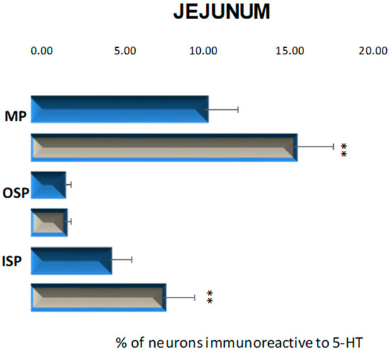 Schematic diagram of the proportion of perikarya immunoreactive to 5-HT of the control (blue bars) and experimental group (grey bars) in the particular parts of jejunum. MP—the myenteric plexus; OSP—the outer submucosal plexus; ISP—the inner submucosal plexus. ** p < 0.01 indicates differences between all groups for the same neuronal population.