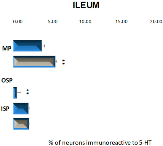 Schematic diagram of the proportion of perikarya immunoreactive to 5-HT of the control (blue bar) and experimental group (grey bars) in the particular parts of ileum. OSP—the outer submucosal plexus; ISP—the inner submucosal plexus; MP—the myenteric plexus. ** p < 0.01 indicates differences between all groups for the same neuronal population.