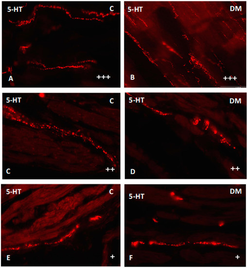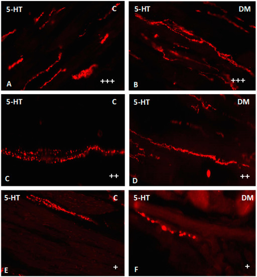 - Takahara, H.; Fujimura, M.; Taniguchi, S.; Hayashi, N.; Nakamura, T.; Fujimiya, M. Changes in serotonin levels and 5-HT receptor activity in duodenum of streptozotocin-diabetic rats. Am. J. Physiol. Liver Physiol. 2001, 281, G798–G808. [Google Scholar] [CrossRef] [Green Version]