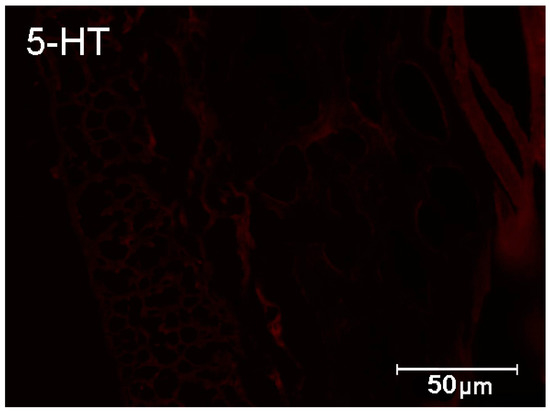 Six weeks after diabetes induction, animals in both groups were deeply anesthetized via intravenous administration of pentobarbital 60 mg/kg body weight (Vetbutal, Biowet, Poland). Afterward, pigs were perfused, and the gastrointestinal tract was prepared as previously described [28]. Next, 2 cm long fragments of the small intestine from the place where nerves from inferior mesenteric ganglia supply the intestine were collected. The samples were postfixed by immersion by the 4% paraformaldehyde for 1 h, rinsed several times with phosphate buffer (PB), and finally transferred to 30% sucrose solution and stored at 4 °C until sectioning. The tissue blocks were cut in frontal or sagittal planes using a Microm HM 560 cryostat (Carl Zeiss, Germany) at a thickness of 12 μm and mounted on gelatinized glass. Subsequently, sections were double-stained by first incubating with primary antisera overnight. Following antibodies were used marker Hu C/D proteins (dilution 1:1000; host rabbit; Invitrogen, Waltham, MA, USA; code A-21271) and serotonin (dilution 1:1000; host rabbit; Zymed Laboratories, San Francisco, CA, USA, code 30778610) were used. After overnight incubation with bovine serum albumin (BSA), the sections were incubated with secondary antibodies Alexa Fluor 488 (dilution 1:1000; host donkey; Invitrogen, USA; code A21202) and Alexa Fluor 546 (dilution 1:1000; host donkey; Invitrogen, USA; code A10040). Both in primary and secondary antibodies, slides were incubated at room temperature. The slides were viewed and photographed using an Olympus BX51 microscope equipped with epifluorescence and appropriate filter sets, coupled with a digital monochromatic camera (Olympus XM 10) connected to a PC and analyzed with Cell Dimension software (Olympus, Tokyo, Japan). Standard controls, i.e., pre-absorption for the serotonin antisera 20 μg per 1 mL of antibody at working dilution. Additionally, omission and replacement of the respective primary antiserum with the corresponding non-immune serum completely abolished immunofluorescence and eliminated specific staining (Figure 11).