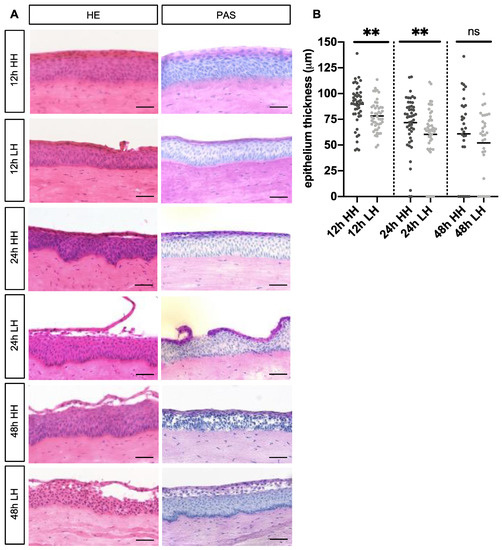 To evaluate histological changes caused by LH (30% humidity), HE and PAS staining were performed, while controls were incubated at HH (95% humidity). Histological examination revealed that the LH treated group for 12 h exhibited small desquamation of surface epithelial cells in comparison to the control group. However, detachment of the superficial cells was observed in porcine corneas incubated at LH for 24 h compared to controls (Figure 1A). The glycoprotein layer covering the apical epithelium was detaching from the apical layer when subjected to LH for 24 h, but this detachment could not be observed in the control group which was incubated at HH (Figure 1A). Moreover, the epithelium thickness was reduced in samples treated with LH for 12 h (78.29 µm ± 2.11) and for 24 h (60.34 µm ± 3.98) in comparison to the ones submitted to HH for 12 h (89.77 µm ± 3.17; p = 0.003) and for 24 h (71.80 µm ± 3.75; p = 0.009) (Figure 1B).