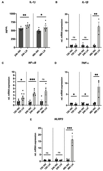 Moreover, environmental stress, such as LH and high osmolarity, leads to activation of NLRP3. Activated NLRP3 ultimately promotes maturation and secretion of IL-1β [13]. Because of this, mRNA expression of NLRP3 was also checked in this study, and an upregulation in corneas submitted to LH for 48 h was observed (Figure 2E).