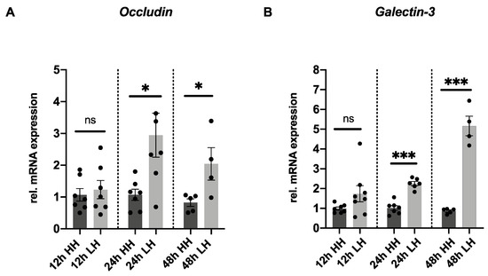 Occludin mRNA expression has been described as an early marker that predicts the severity of corneal damage [33]. Therefore, to further investigate why epithelial cells detach from corneal epithelial, especially in the samples submitted to LH, mRNA expression of the tight junctions’ marker, occludin, was analyzed. Moreover, mRNA expression of the glycocalyx marker, galectin-3, was performed. A 2.94-fold (±0.69; p = 0.02) upregulation of occludin mRNA expression was observed in samples subjected to LH stress for 24 h and a 2.56-fold (±0.64; p = 0.04) upregulation was shown in the 48 h LH group compared to the corresponding HH samples. No difference in occludin expression was identified in porcine corneas incubated at LH for 12 h (1.23 ± 0.29; p = 0.65) in comparison to the 12 h HH controls (Figure 3A). Galectin-3 mRNA was 2.25-fold (±0.11; p < 0.001) upregulated in samples incubated at LH for 24 h and 5.16-fold (±0.49; p < 0.001) upregulated in those cultivated at LH for 48 h. No difference in galectin-3 expression was verified in porcine corneas incubated at LH for 12 h (1.74 ± 0.41; p = 0.12) in comparison to the 12 h HH controls (Figure 3B). Upregulation of occludin and galectin-3 expression was clearly induced in the porcine model incubated at LH for 24 h and 48 h.