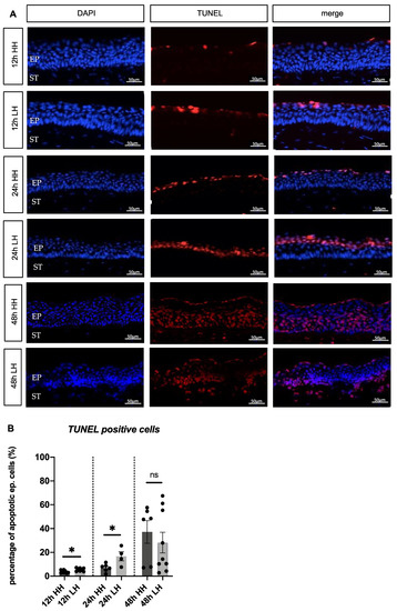 Incubation for 12 h and for 24 h at LH induced apoptosis in the corneal epithelium. (A) Representative images of porcine corneas incubated at LH for 12 h, 24 h and for 48 h and stained with TUNEL (red) and DAPI (blue) and controls incubated at HH for the same time-period. (B) Increased percentage of apoptotic cells in porcine corneas incubated at LH for 12 h and for 24 h in comparison to the HH samples (12 h LH = 5.38% ± 0.48/12 h HH = 3.87% ± 0.44 apoptotic cells; p = 0.036) (24 h LH = 16.69% ± 3.79/24 h HH = 6.98% ± 1.37 apoptotic cells; p = 0.0229) (n = 8 for 12 h LH/n = 8 for 12 h HH/n = 4 for 24 h LH/n = 6 for 24 h HH). No significant difference was observed between samples submitted to LH and HH for 48 h (48 h LH = 28.23% ± 8.67/48 h HH = 37.19% ± 9.53 apoptotic cells; p = 0.86) (n = 9 for 48 h LH/n = 6 for 48 h HH). LH: low humidity. HH: high humidity. EP: epithelium. ST: stroma. DAPI: 4′,6-diamidino-2-phenylindole. TUNEL: TdT-mediated dUTP-biotin nick end labelling. ns: not significant. Scale bar = 50 µm. The bars represent the mean values, and the SEM is shown. All data are shown as mean ±SEM. * p < 0.05.