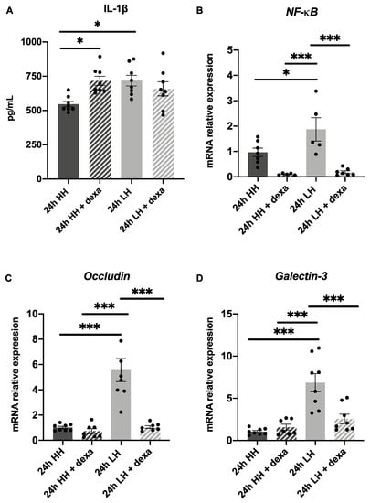 To evaluate the effect of dexa treatment on the LH induced inflammation, the secretion of IL-1β and the mRNA expression of NF-κB, occludin and galectin-3 was investigated. Comparable to the prior results (Figure 2A), an augmentation of IL-1β was found in samples submitted to LH (718.10 pg/mL ± 38.85) in comparison to the ones incubated at HH (546.00 pg/mL ± 19.49; p = 0.02) (Figure 5A). However, no significant difference in IL-1β secretion was observed in samples incubated at LH and treated with dexa, in comparison to the ones incubated at LH (LH + dexa = 658.10 pg/mL ± 51.65/ LH = 718.10 pg/mL ± 38.85; p = 0.68) (Figure 5A). Treatment with dexa in corneas incubated at LH could significantly prevent an increase in NF-κB mRNA (0.18 ± 0.05; p < 0.001) in comparison to the ones incubated at LH (1.87 ± 0.46) (Figure 5B). Similar to previous results (Figure 3A), an upregulation of occludin mRNA (5.56 ± 0.91; p < 0.001) was observed in samples incubated at LH in comparison to the ones submitted to HH (Figure 5C). Furthermore, a significant inhibition of occludin mRNA expression (1.05 ± 0.11; p < 0.001) was observed in corneas incubated at LH + dexa in comparison to the ones incubated at LH (Figure 5C). In addition, the upregulation of galectin-3 mRNA expression (LH: 6.85 ± 1.07; p < 0.001) in samples incubated at LH could be significantly counteracted by treatment with dexa (2.57 ± 0.55; p < 0.001) (Figure 5D). These findings confirm that dexa counteracts the LH-triggered mRNA increase in NF-κB, occludin and galectin-3 and can also reduce inflammatory processes at the transcriptional level in the ex vivo model.
