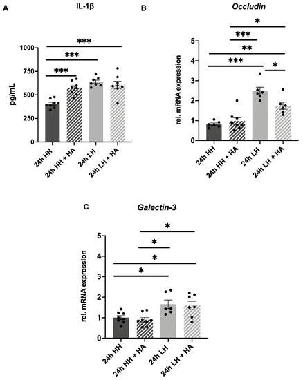 Next, some markers were tested to investigate whether treatment with HA could also counteract the effects caused by LH. An increase in IL-1β was found in samples exposed to LH (638.60 pg/mL ± 18.68), to LH + HA (607.00 pg/mL ± 37.54) and to HH + HA (571.20 pg/mL ± 25.41) in comparison to the ones incubated at HH alone (406.10 pg/mL ± 16.45; p < 0.001) (Figure 6A). Again, in this sample series, an upregulation of occludin mRNA expression 2.48 ± 0.19; p < 0.001) was observed in corneas incubated at LH in comparison to the ones submitted to HH only (Figure 6B). Furthermore, treatment with HA could significantly reduce the increase in occludin mRNA expression in samples submitted to LH and treated with HA (1.75 ± 0.18; p = 0.03) compared to the ones incubated at LH without treatment (2.48 ± 0.19) (Figure 6B). In addition, an upregulation of galectin-3 mRNA expression was observed in samples incubated at LH (1.66 ± 0.21; p = 0.04) in comparison to the ones submitted to HH (Figure 6C), but no counteracting effect of HA treatment could be detected (1.60 ± 0.21 p > 0.99). This finding suggests that HA was able to partially counteract the effects of incubation at LH at a transcriptional level.