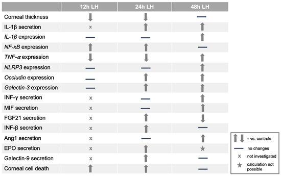 Table summarizing the results of ex vivo porcine corneal incubation at LH for 12 h, 24 h and 48 h. An increase or decrease in each factor was considered when the comparison between LH and HH was statistically significant, or in the case of the Cytokine Antibody Array when the ratio LH/HH was lower than 0.5 or higher than 1.5.