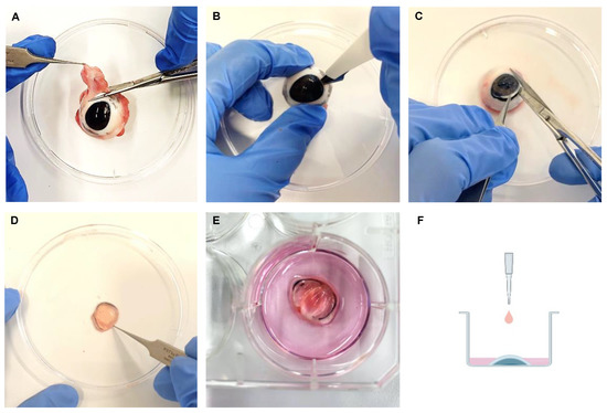 Porcine corneal extraction. (A) Muscles and tissues around the eye were removed. (B–D) To extract the cornea a cut was made around it with a scalpel and finalized with scissors. (E) A thin part of the sclera was left around the cornea. (F) The corneas were incubated in a 6-well plate, facing upwards, and the appropriate media was added. (F) Schematic figure depicts air-lifting technique, porcine cornea in a 6 well-plate facing upwards and culture media in pink meets the corneal epithelium surface.