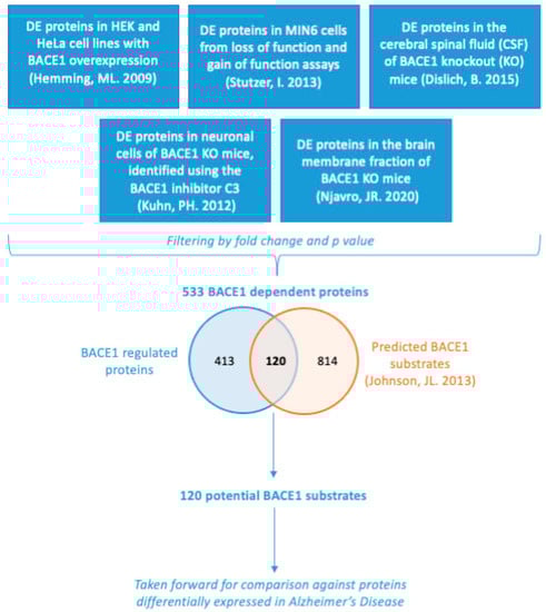 Summary of how the list of 533 BACE1-dependent proteins and 120 BACE1 potential substrates was obtained. Proteomics data from various studies acquired through datamining was filtered by fold change and p value and combined. This list of 533 BACE1-dependent proteins was then compared against a list of 934 bioinformatically predicted BACE1 substrates [], to give a list of 120 BACE1 potential substrates which was the basis of further analysis [,,,,].
