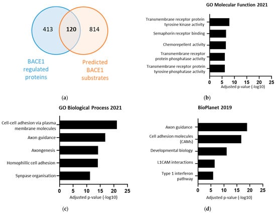 The 120 BACE1 substrates, identified from BACE1 experimental dependent proteins overlaid with BACE1 predicted substrates, were found to be associated with various functions including axon guidance and cell adhesion. (a) Venn diagram overlaying 533 experimental secreted BACE1 dependent proteins, and 934 bioinformatically predicted BACE1 substrates []. (b–d) Terms from various databases when the 120 BACE1 substrates where input into Enrichr, showing log of adjusted p-value.