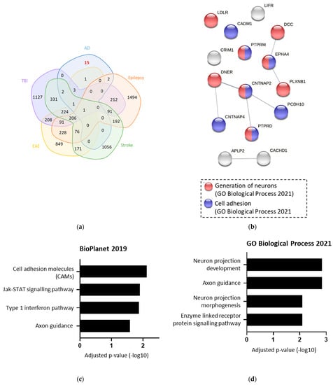 To confirm which of these 25 proteins were changed specifically in AD, the list was compared against four other cerebral diseases (Figure 5a). This identified 15 proteins that are likely to be altered specifically in AD. Functional analysis of these 15 AD-specific BACE1 substrates found associations with Jak/STAT signalling, cell adhesion, and type 1 interferon pathway (Figure 5b,c). When input into STRING to investigate protein interactions, neuron generation and cell adhesion were the most prevalent functional associations (Figure 5d).