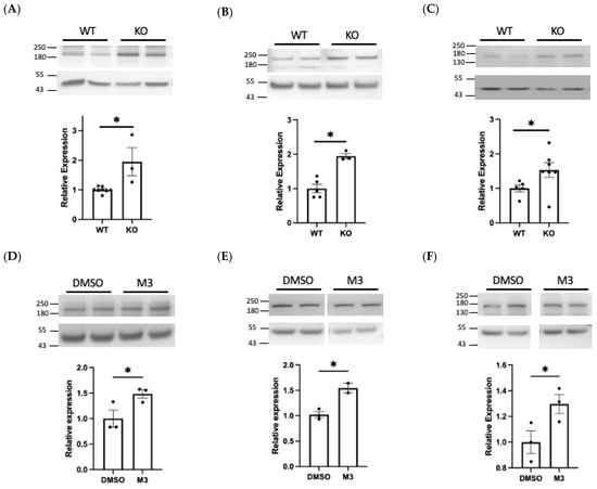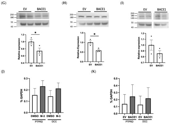 DCC, also identified as a novel BACE1 substrate, was significantly increased 1.53-fold (p < 0.05) in BACE1−/− BECs and following M-3 treatment (1.29, p < 0.05) (Figure 7C,F). BACE1 overexpression produced modest but non-significant changes in DCC expression in hCMEC/D3 (Figure 7I). PTPRD and DCC gene expression in hCMEC/D3 was not altered by BACE1 inhibitor treatment or overexpression (Figure 7J,K).